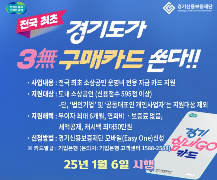 | 신청방법 | 경기신용보증재단 모바일앱(Easy One) 신청방법 (이용시간 오전 9시~ 오후 4시) - 모바일 앱(Easy One) 로그인 〉 신규보증신청 클릭 〉 모바일보증 '신청하기' 클릭* 〉 보증상품 중 '힘내GO 카드보증' 선택 *모바일보증 신청 시 신규로 사업장 사진촬영 및 업로드가 필요합니다.(기존 사진 제출불가) *모바일보증(심사) 진행불가 시 직접심사 '신청하기' 클릭 ☞ 보증싱인 및 약정 이후 가까운 IBK기업은행 영업점 방문하여 카드발급 *비대면 카드발급은 1월 20일부터 기업은행 모바일앱(i-ONE Bank)에서 가능 |
