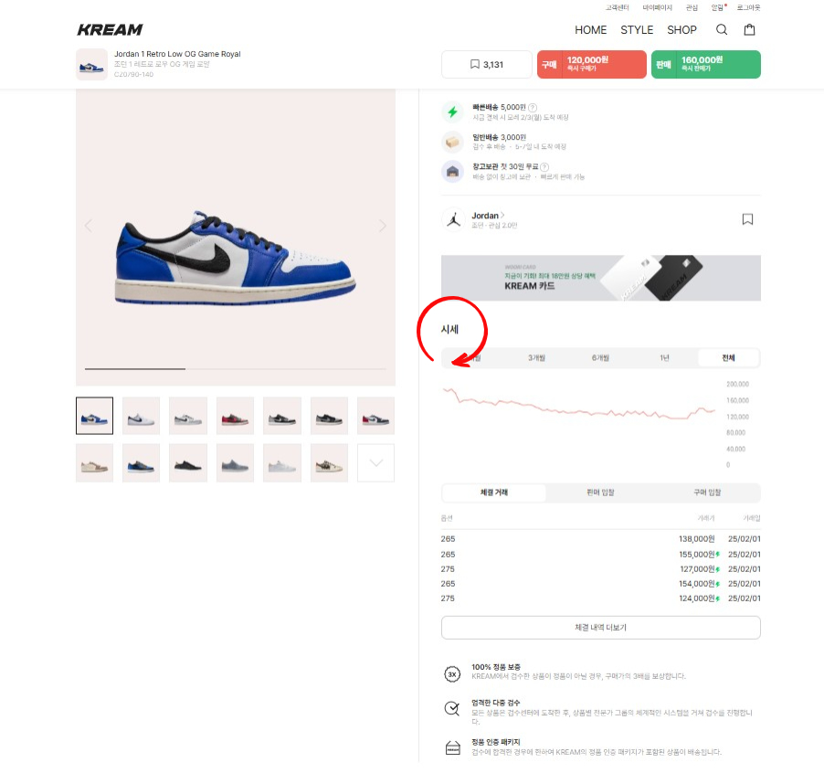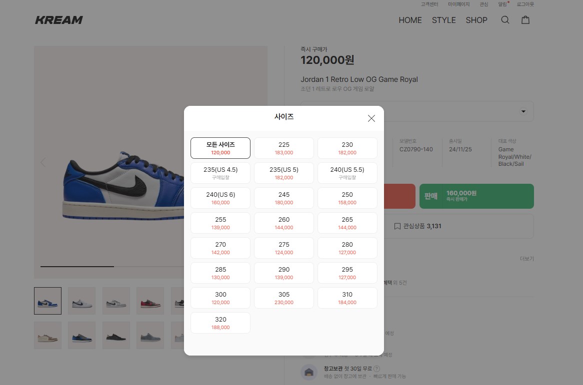 - 나이키 조던 1 로우(정가 169,000원) → KREAM에서 120,000원에 거래된 내역 확인 가능