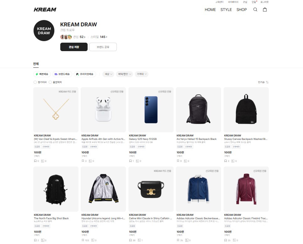 KREAM에서는 100원 드로우 이벤트를 통해 인기 신발을 초저가에 구매할 기회를 제공합니다.