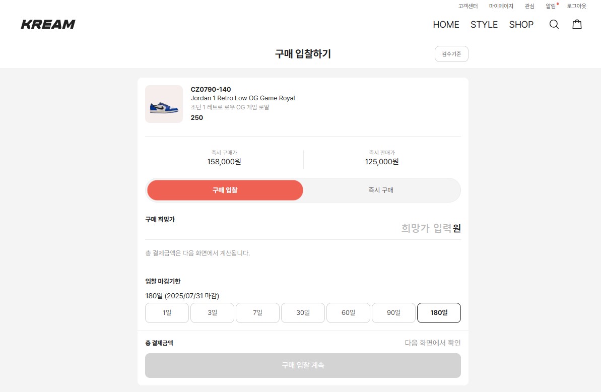 KREAM에서는 즉시 구매 외에도 입찰 기능이 있습니다.