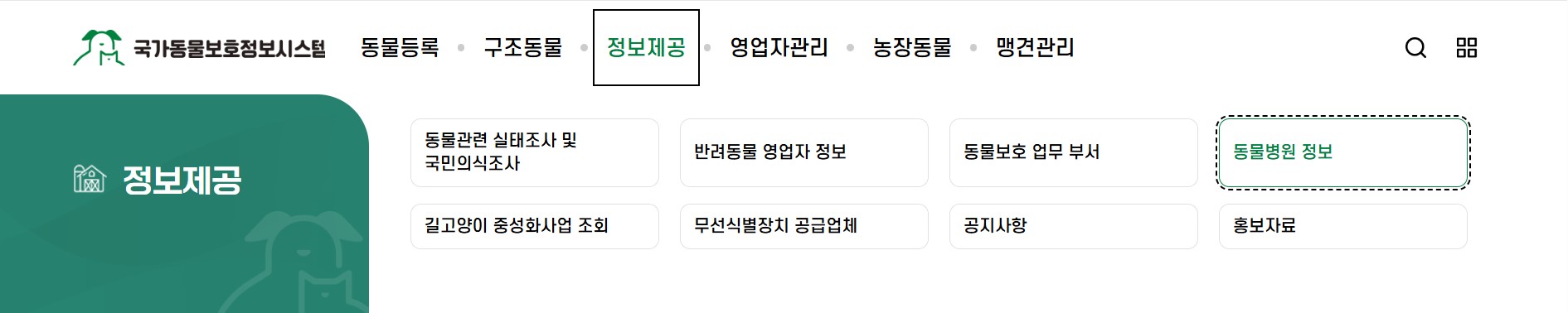 - 동물병원 정보 메뉴 선택 : 정보제공 메뉴에서 동물병원 정보 메뉴를 클릭합니다.