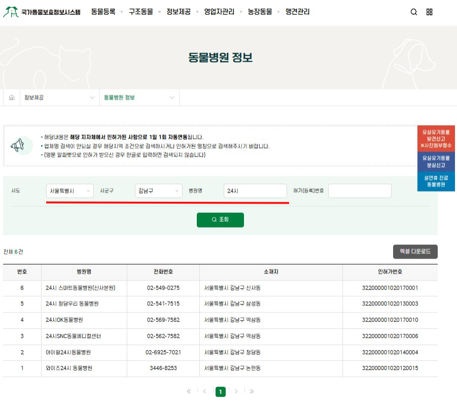 - 결과 확인 : 조회 결과에서 근처에 위치한 24시 동물병원의 주소, 전화번호, 인허가번호를 확인할 수 있습니다.