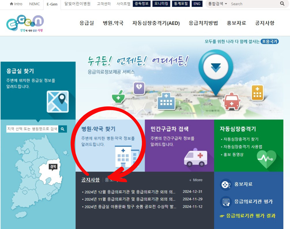 - 원하는 정보 찾기: 홈페이지 상단 메뉴를 활용해 필요한 정보를 탐색합니다. (예 : 응급의료기관 검색, 응급처치 요령)