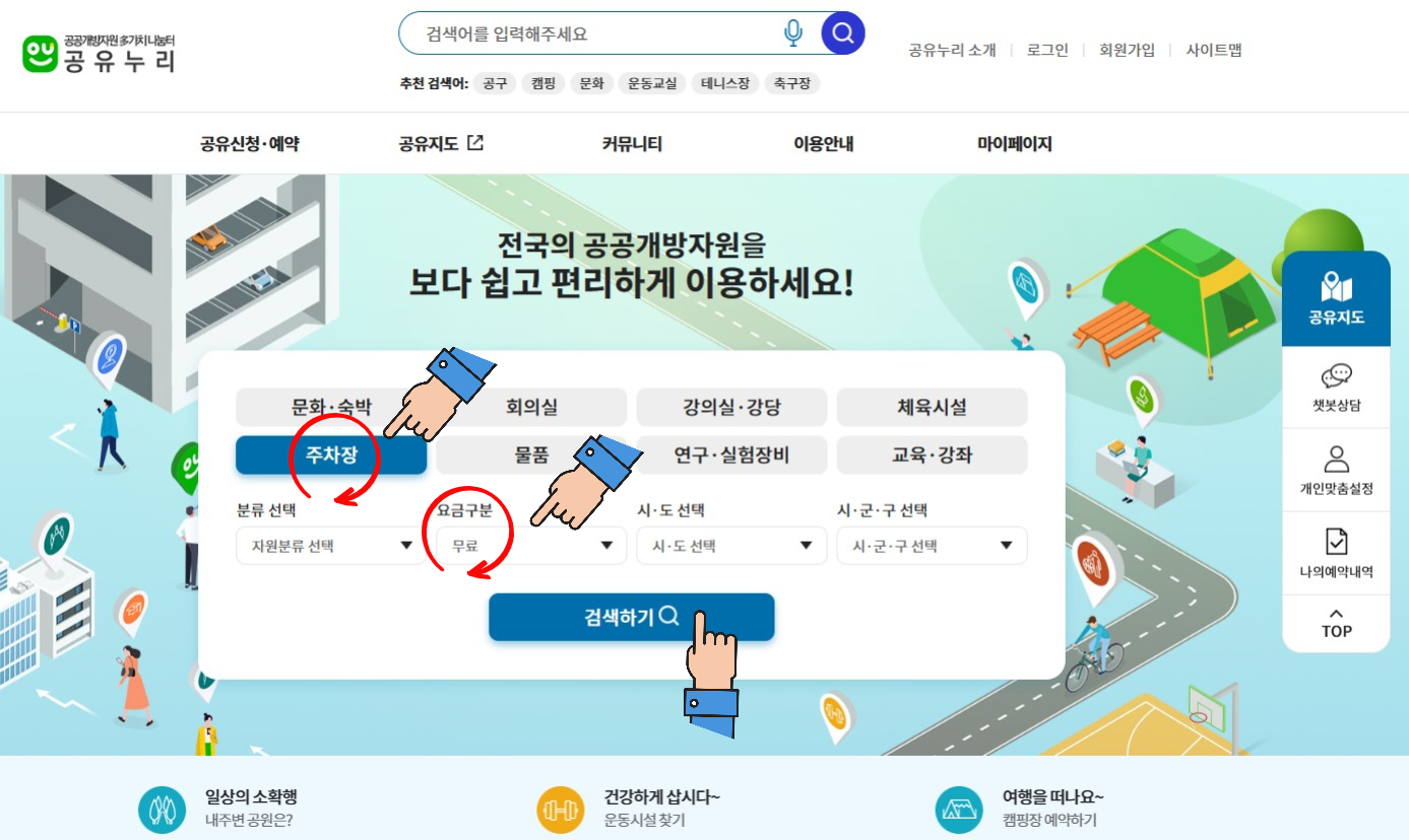 공유누리 홈페이지에서 무료주차장을 찾는 방법은 다음과 같습니다.